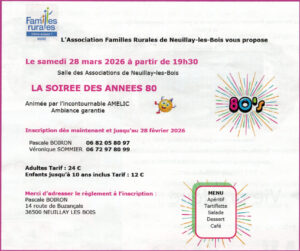 SOIREE ANNEE 80 28/03/202624/11/2025 admin Quand 28/03/2026 19:30 - 23:45 Ajouter au Calendrier Télécharger ICS Calendrier Google iCalendar Office 365 Outlook Live